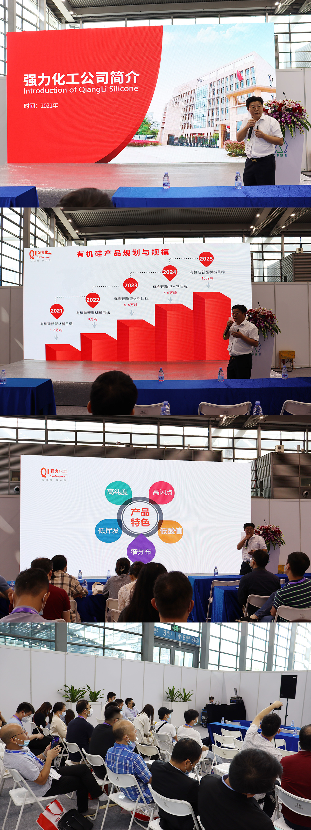 強力化工董事長葉光華發(fā)表重要演講,講述了當(dāng)今有機硅行業(yè)的現(xiàn)狀并對前景的展望,同時也分享我司高端產(chǎn)品高純度硅油制作工藝,全場干活滿滿,座無虛席。