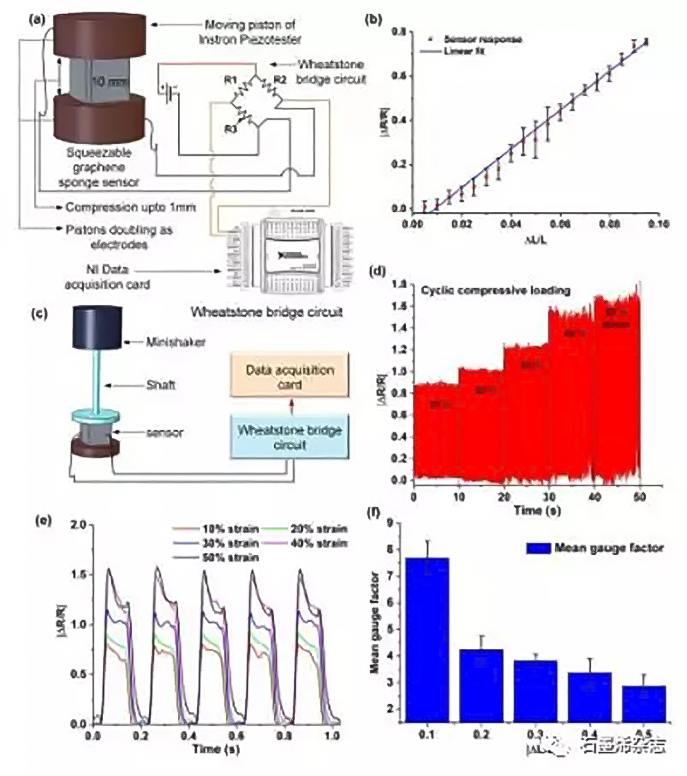 4.石墨烯-PDMS泡沫傳感器表征:(a)用于進(jìn)行壓阻性表征實(shí)驗(yàn)的裝置的示意圖;(b)石墨烯- PDMS泡沫傳感器的歸一化電阻隨外加壓縮應(yīng)變的變化曲線高達(dá)9.5%;(c)用于在10-50%范圍內(nèi)對(duì)較大的壓縮應(yīng)變進(jìn)行壓阻特性實(shí)驗(yàn)的裝置示意圖;(d)在不同應(yīng)變下(10% ~ 50%),5種不同壓縮載荷下傳感器響應(yīng)歸一化電阻變化曲線圖;(e)疊加圖,顯示了傳感器在10%-50%五種不同壓縮應(yīng)變下的歸一化電阻變化;(f)柱狀圖顯示了石墨烯- PDMS泡沫傳感器在10%-50%五種不同壓縮應(yīng)變下的計(jì)算應(yīng)變因子。
