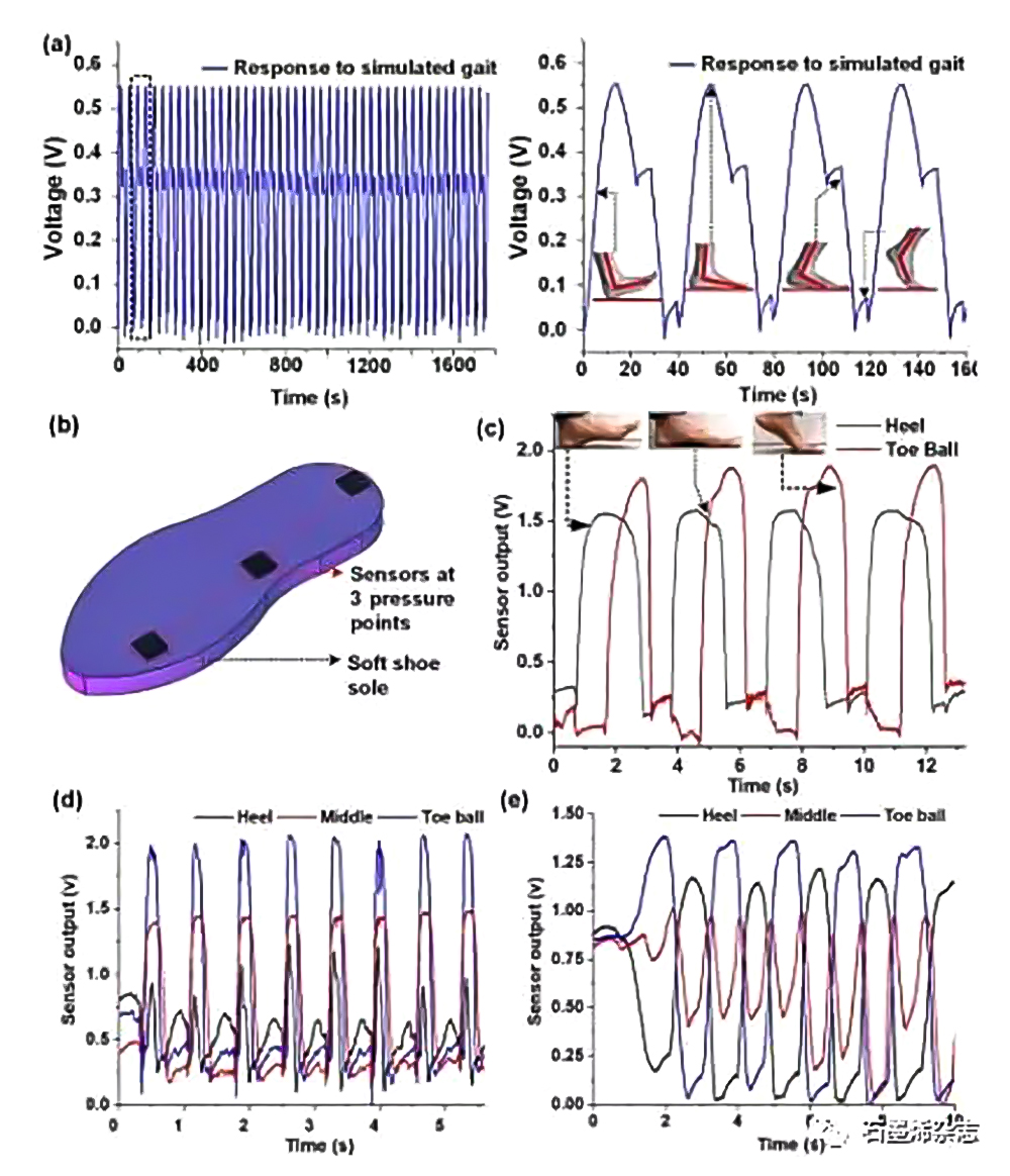 針對(duì)個(gè)性化醫(yī)療監(jiān)護(hù)的需求,對(duì)柔性、超敏、可擠壓、可貼裝和可穿戴傳感器的需求日益增長,因此有必要探索基于納米聚合物復(fù)合材料的新型傳感器。下面介紹一下關(guān)于敏感的3D可壓縮石墨烯-聚二甲基硅氧烷(PDMS)泡沫壓阻傳感器。該傳感器通過將多層石墨烯納米顆粒注入糖基多孔PDMS泡沫結(jié)構(gòu)中來實(shí)現(xiàn)。所制得的壓阻式泡沫塑料傳感器的靜態(tài)和動(dòng)態(tài)壓縮應(yīng)變測(cè)試結(jié)果顯示,在0-50%的應(yīng)變范圍內(nèi),存在兩個(gè)線性響應(yīng)區(qū)域,平均應(yīng)變因子為2.87~8.77。此外,動(dòng)態(tài)刺激響應(yīng)揭示了傳感器的能力,有效地跟蹤動(dòng)態(tài)壓力高達(dá)70赫茲的頻率。該傳感器在36000次循環(huán)壓縮載荷和100次完整的人類步態(tài)運(yùn)動(dòng)周期中顯示出很高的穩(wěn)定性。通過仿真步態(tài)模型和實(shí)時(shí)步態(tài)表征實(shí)驗(yàn),3D傳感泡沫體可精確的對(duì)人體步態(tài)進(jìn)行監(jiān)測(cè)。實(shí)時(shí)步態(tài)實(shí)驗(yàn)表明,鞋底三個(gè)位置的壓力分布信息不僅可以區(qū)分步行和跑步等不同的人類步態(tài),還可以識(shí)別可能的跌倒情況。本論文還展示了傳感器區(qū)分足部解剖結(jié)構(gòu)的能力,如扁平足(低中心弓)和中弓腳,這是更有效的生物力學(xué)。此外,傳感器能夠感知各種基本的關(guān)節(jié)運(yùn)動(dòng)反應(yīng),證明它們適合于個(gè)性化醫(yī)療應(yīng)用。