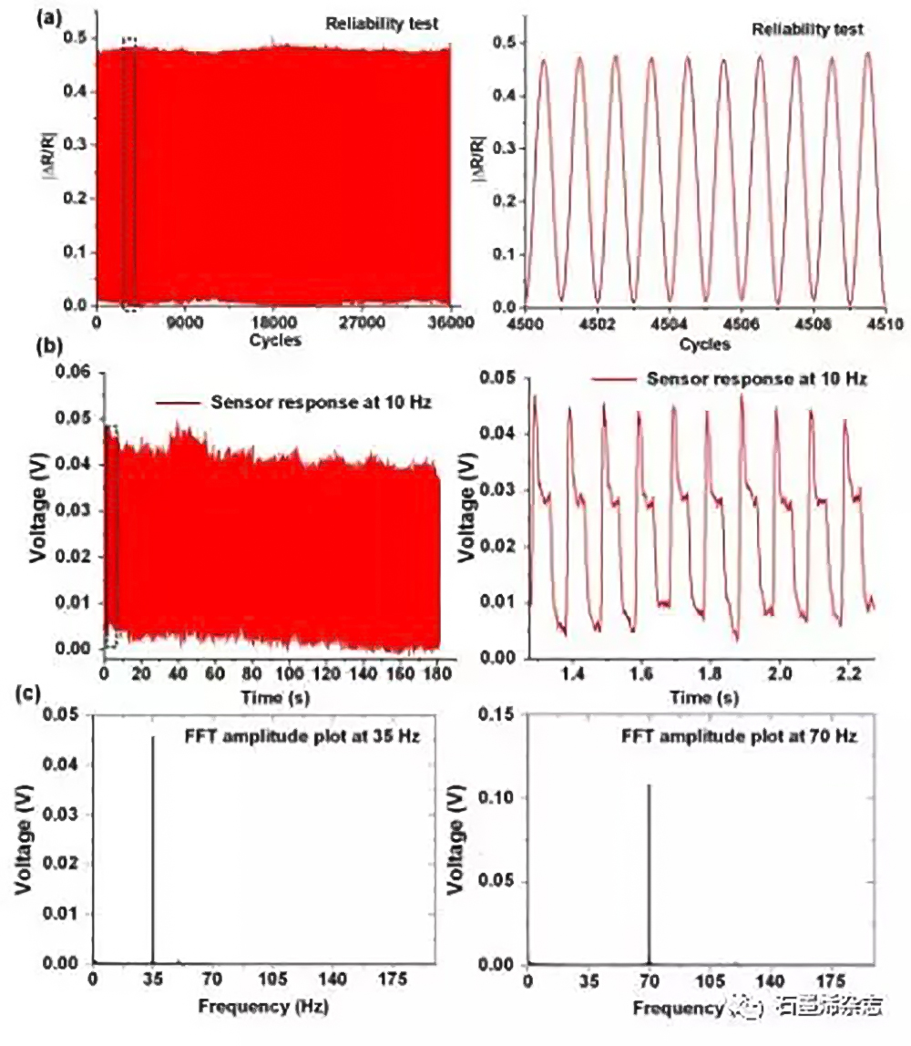 5. 循環(huán)壓縮加載和動(dòng)態(tài)應(yīng)變傳感特性的石墨烯泡沫塑料傳感器:(a)傳感器在5%壓縮應(yīng)變下對(duì)循環(huán)加載和卸載的響應(yīng);(b)傳感器在10 Hz時(shí)時(shí)域響應(yīng)的曲線圖;(c)在35 Hz和70 Hz時(shí)傳感器響應(yīng)的FFT振幅圖。