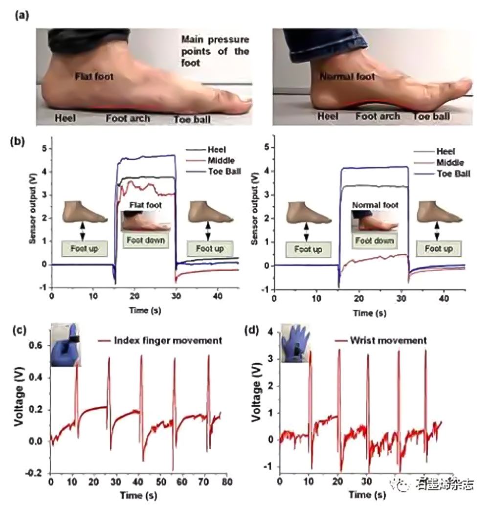 7. 石墨烯- PDMS泡沫傳感器在足部解剖和人體運(yùn)動(dòng)監(jiān)測(cè)中的應(yīng)用:(a)比較低足弓/扁平足與中等足弓生物力學(xué)效率的圖像;(b)比較兩種不同足型獲得的SSA壓力響應(yīng);(c)傳感器對(duì)食指輕彈的響應(yīng);(d)傳感器對(duì)手腕輕彈的響應(yīng)。